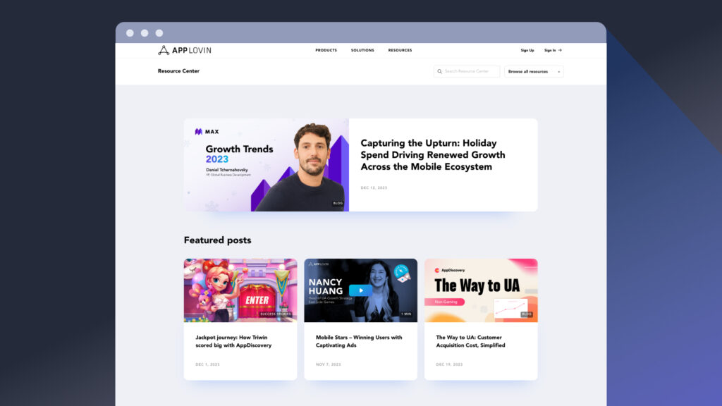 In addition, you can browse content by topics such as Industry News and User Acquisition, or find information specific to our products across a variety of formats including blogs, videos, and reports.