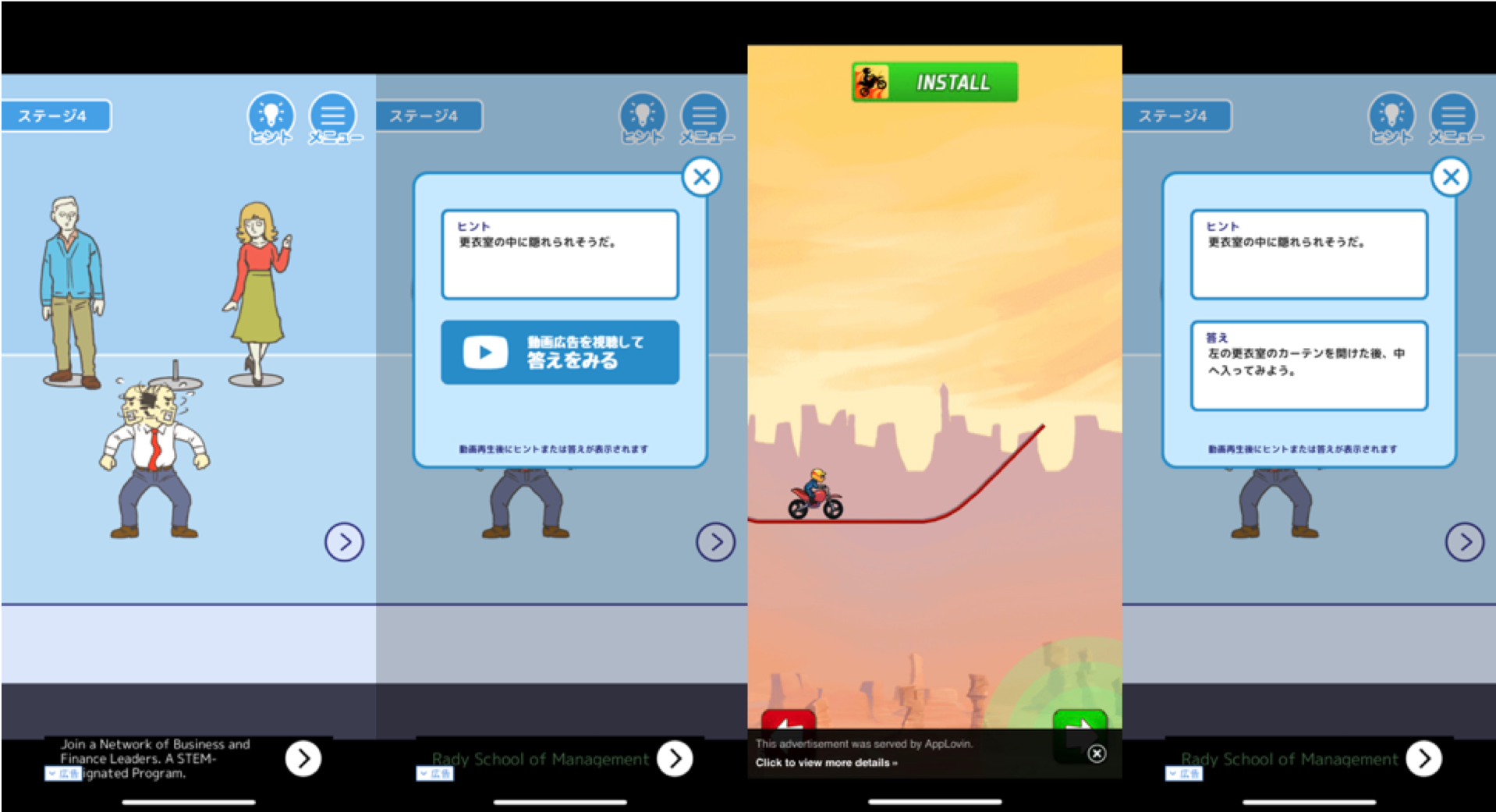 動画フォーマットに関してはヒントを見るための動画リワードと、一息付いたタイミングでの動画インタースティシャルを実装しています。バナーはフッターとレクタングルです。